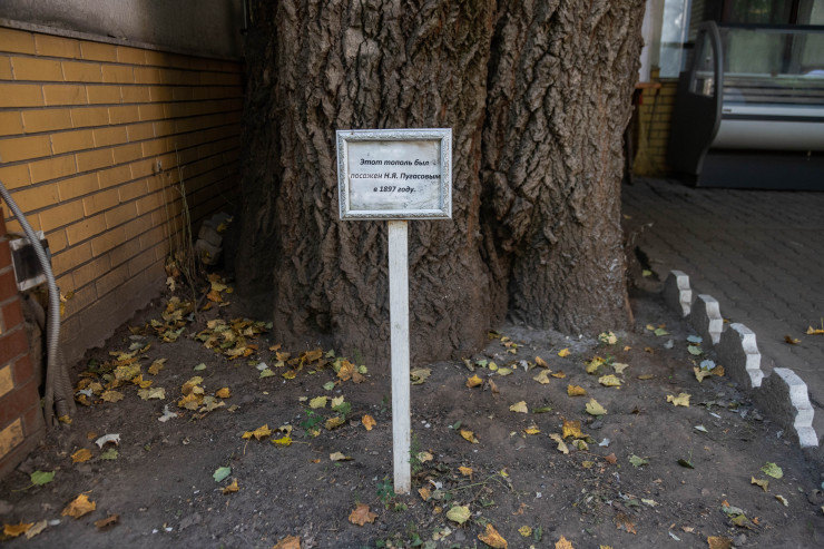 Недалеко от трехсотлетнего дуба во дворе детского сада № 109 стоит огромный тополь, возле которого есть табличка "Этот тополь был посажен Н. Я. Пугасовым в 1897 году".