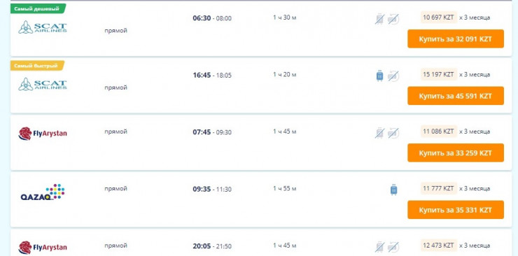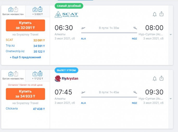 Билеты на рейс Алматы - Нур-Султан на 3 июля 2021 года. Скриншоты с сайтов агрегаторов по продаже билетов