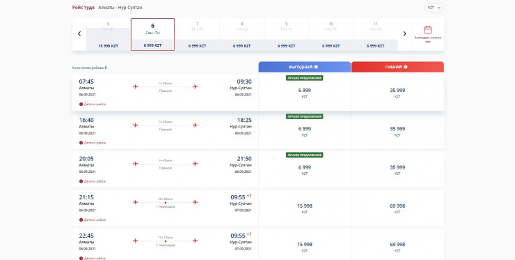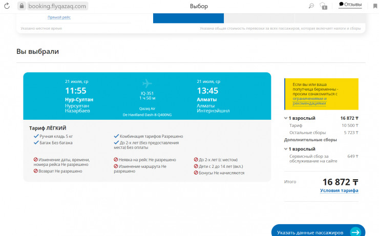 Рассмотрим вариант покупки билета по направлениям Алматы - Нур-Султан и Нур-Султан - Актобе (один из самых популярных у авиакомпании, рейса из столицы в Актау у Qazaq Air нет) через месяц - 21 июля 2021 года по тарифу "Легкий":