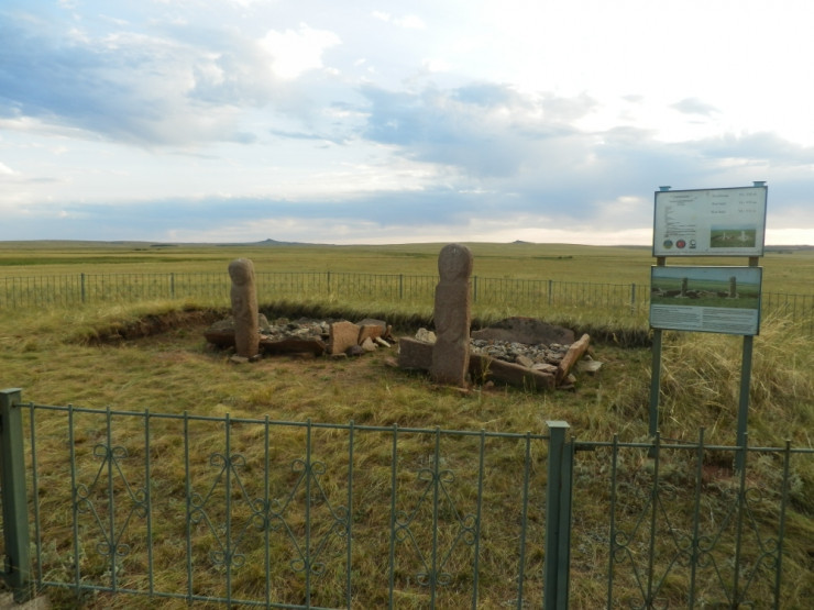 Каменные изваяния обычно помещались у края каменных оградок захоронения с восточной стороны. Статуи изображали национальных героев, в левой руке которых был меч, в правой - ритуальный сосуд, предположительно, с водой.
