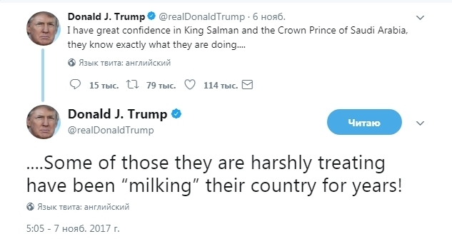 Комментируя аресты, президент США Дональд Трамп написал в Twitter, что поддерживает короля Салмана, и отметил, что некоторые из задержанных годами "доили" страну.