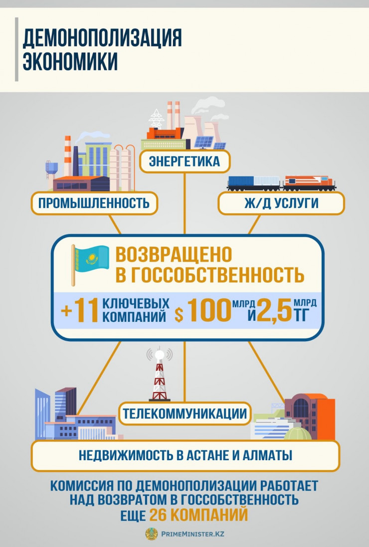 Не менее важным направлением работы правительства в этом году стало противодействие частным монополистам, развитие прозрачной рыночной конкуренции и возврат в государственную собственность незаконно переданных активов. Основные решения по этим вопросам принимались в рамках созданной по поручению Президента Комиссии по демонополизации экономики, которую возглавил премьер-министр Алихан Смаилов.