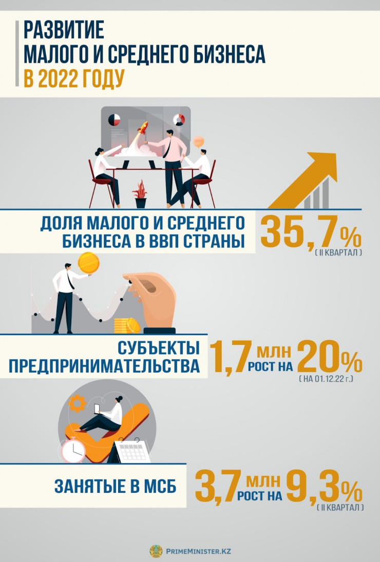 В целом доля малого и среднего бизнеса в ВВП страны в 2022 году достигла 35,7 процента (II квартал), число субъектов предпринимательства выросло на 20 процентов, до 1,7 миллиона (на 1 декабря), а количество занятых в МСБ людей – на 9,3 процента, до 3,7 миллиона (II квартал).