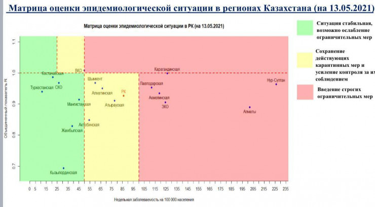 Согласно матрице оценки эпидемиологической ситуации в регионах Казахстана на 13 мая, в "красной" зоне находятся Нур-Султан, Алматы, Акмолинская, Западно-Казахстанская, Карагандинская и Павлодарская области.