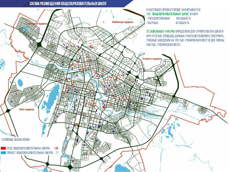 "Так, к примеру, в текущем году в столице построим и введем в эксплуатацию 11 школ: в районе Есиль – 6 школ, в районе Алматы – 4 школы, в районе Сарыарка - еще одну школу, в районе Байконыр - одну школу (сдача - в 2023 году). Данные учебные заведения позволят создать свыше 23 тысяч ученических мест.