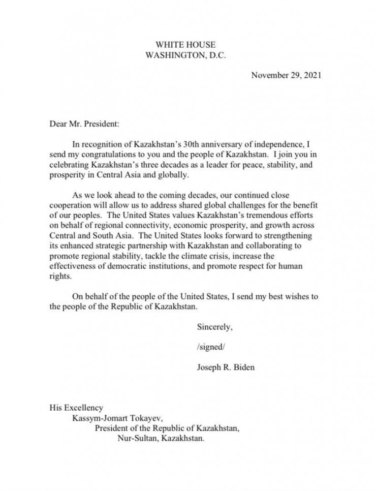 "Я присоединяюсь к вам в праздновании 30-летия Казахстана как лидера за мир, стабильность и процветание в Центральной Азии и в мире", - отметил американский лидер в письме Президенту Казахстана.
