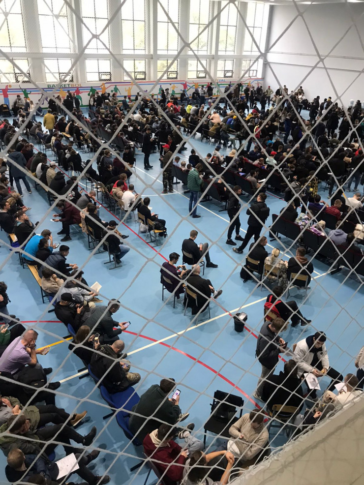 Большая очередь образовалась у ЦОНа для обслуживания россиян в Алматы Кадр из видео