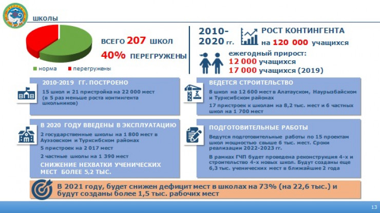 В текущем году за счет бюджета ведется строительство 8 школ на 12,6 тысячи мест в Алатауском, Наурызбайском и Турксибском районах. Продолжается строительство 17 пристроек к школам на 8,2 тысячи мест. Также будет открыто 6 частных школ на 1 700 мест.