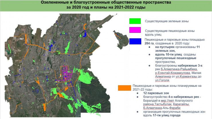 Так, горожанам в онлайн-формате были презентованы планы по созданию пешеходных пространств. На сегодня в городе имеется 110 прогулочных пешеходных зон общей протяженностью 54 километра. Руководство города планирует дальше развивать создание новых общественных пространств как в центральной части, так и в периферийных районах, эффективно использовав рекреационный потенциал города. К примеру, проект преобразования территории вдоль автомобильных дорог от международного аэропорта до парка Первого Президента протяженностью 25 километров по следующим основным улицам: Майлина – Бухтарминская – Кульджинский тракт – ВОАД – Аль-Фараби.