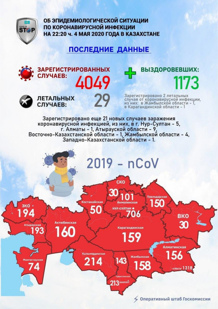 "Об эпидемиологической ситуации по коронавирусу на 22:20 часов 4 мая 2020 года в Казахстане. Зарегистрирован еще 21 новый случай заражения коронавирусной инфекцией, из них в городе Нур-Султане - 5, в городе Алматы - 1, в Атырауской области - 9, в Восточно-Казахстанской области - 1, в Жамбылской области - 4, в Западно-Казахстанской области - 1", - говорится в сообщении Оперативного штаба Госкомиссии.