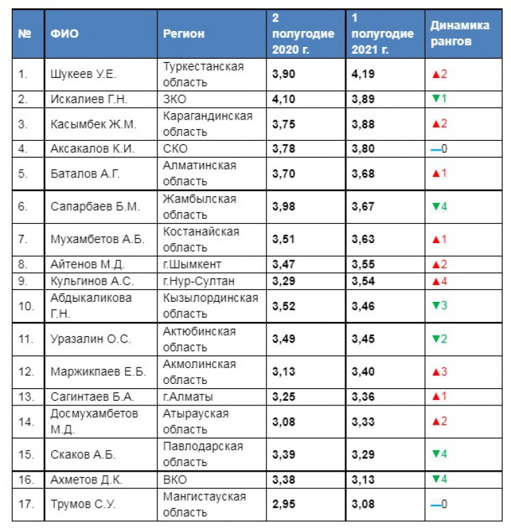Отметим, что в целом за первое полугодие 2021 года все акимы сохранили свои посты, но по итогам опроса в рейтинге акимов регионов сменился лидер – аким Западно-Казахстанской области Гани Искалиев уступил первенство акиму Туркестанской области Умирзаку Шукееву, совокупная оценка деятельности которого составила 4,3 балла из 7 возможных. При этом Гани Искалиев спустился на вторую позицию, потеряв 4 балла. На третью позицию в рейтинге выдвинулся аким Карагандинской области Женис Касымбек с показателем в 3,88 балла.