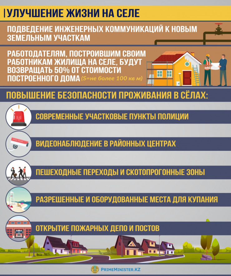 Для повышения безопасности проживания в сельской местности проведут работу по строительству современных участковых пунктов полиции, внедрению в районных центрах видеонаблюдения, установлению в селах пешеходных переходов и скотопрогонных зон, созданию разрешенных и оборудованных мест для купания.