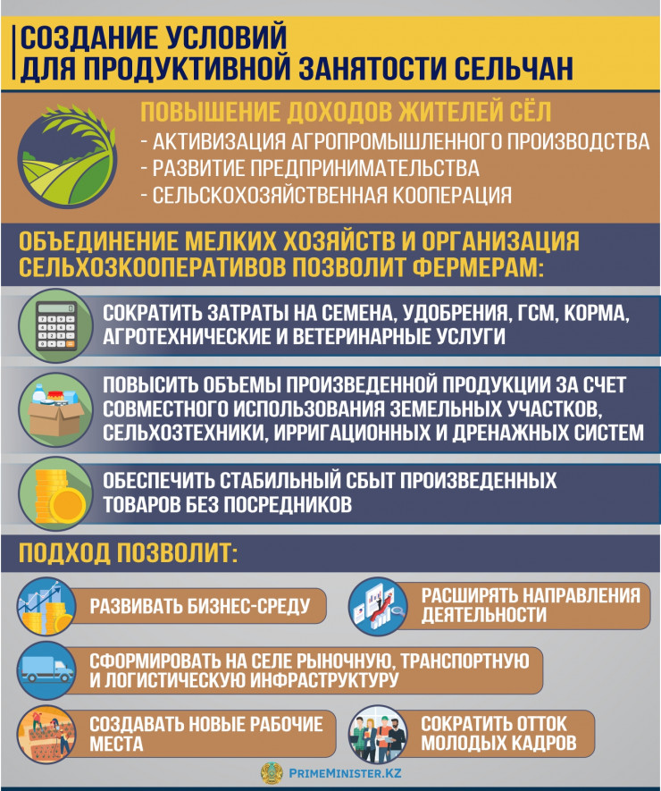 Что касается повышения доходов сельчан, этот вопрос планируется решать путем активизации агропромышленного производства, развития предпринимательства и сельскохозяйственной кооперации. Объединение мелких хозяйств и организация сельхозкооперативов позволит фермерам сокращать затраты на семена, удобрения, ГСМ, корма, агротехнические и ветеринарные услуги, повышать объемы произведенной продукции за счет совместного использования земельных участков, сельхозтехники, ирригационных и дренажных систем, а также иметь стабильный сбыт произведенных товаров без посредников.