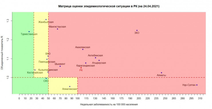 Казахстан продолжает оставаться в "красной" зоне. Опубликована матрица оценки эпидемиологической ситуации в регионах Казахстана на 24 апреля 2021 года, передает Tengrinews.kz со ссылкой на МВК.