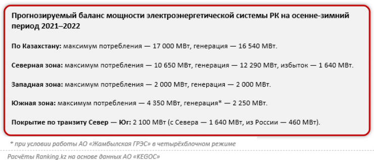 По данным АО KEGOK, в часы максимальных нагрузок потребление мощности в Казахстане превышало прошлогодние значения более чем на 1500 мегаватт, из них по Южной зоне - на 400 мегаватт. При сохранении текущих темпов роста потребления, учитывая необходимость проведения ремонтов на блочных электростанциях, недостаток водных ресурсов АО "Мойнакская ГЭС" (Алматинская область) и нерешенные вопросы с обеспеченностью топливом АО "Жамбылская ГРЭС", дефицит в электроэнергетической системе Казахстана в октябре–декабре может составить порядка 1,7 миллиарда киловатт-часов.