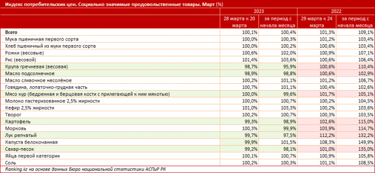 С 20 по 28 марта наблюдалось снижение цены на картофель (на 0,7 процента), репчатый лук (на 0,3 процента), белокочанную капусту (на 0,1 процента), гречневую крупу (на 1,3 процента), подсолнечное масло (на 1,1 процента) и сахар-песок (на 0,8 процента). Без изменений осталась стоимость пшеничной муки первого сорта и хлеба из нее, мяса курицы, пастеризованного молока жирностью 2,5 процента.