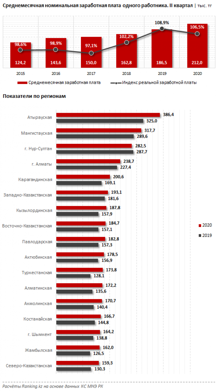 Наибольший размер заработной платы приходится на Атыраускую и Мангистаускую области - 386,4 и 317,7 тысячи тенге, соответственно. Cреднемесячная заработная плата в Нур-Султане составила 282,5 тысячи тенге, в Алматы - 238,7 тысячи тенге. Стоит отметить, что только в вышеперечисленных четырех регионах размер заработной платы больше, чем в среднем по республике.