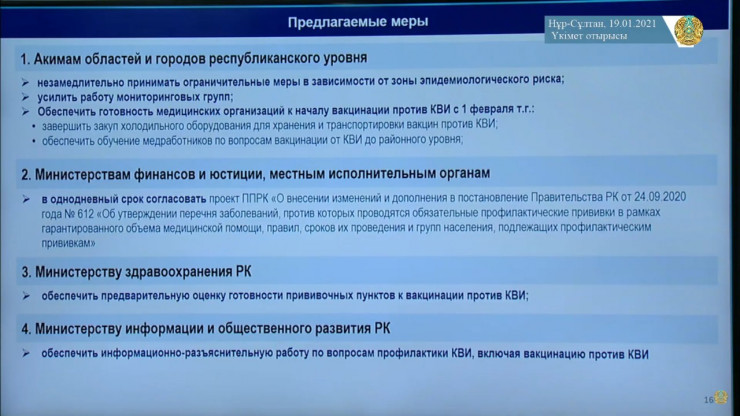 Так, среди предлагаемых им мер - усиление работы мониторинговых групп и незамедлительное принятие ограничений в зависимости от зоны эпидемиологического риска. Также акимам областей и городов республиканского значения нужно завершить закуп холодильного оборудования для хранения и транспортировки вакцин, а также обеспечить обучение медицинских работников.