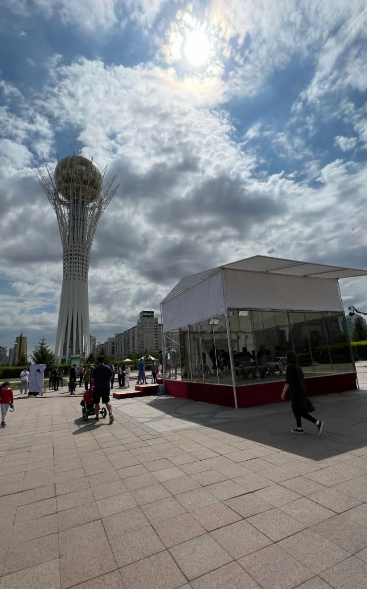 В центре столицы установлена стеклянная студия канала "Хабар". Оттуда сегодня транслируют прямые эфиры, интервью с общественниками, культурными и политическими деятелями, обсуждают суть предлагаемых конституционных реформ.