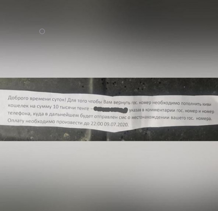 "Добрый времени суток! Для того, чтобы вернуть вам госномер необходимо пополнить кошелек на сумму 10.000 тенге" - писали преступники.