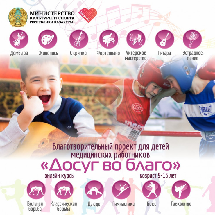 По инициативе Министерства культуры и спорта в Казахстане запустили проект "Досуг во благо". В рамках нового культурно-образовательного проекта дети медицинских работников всей страны бесплатно получают знания в режиме онлайн.
