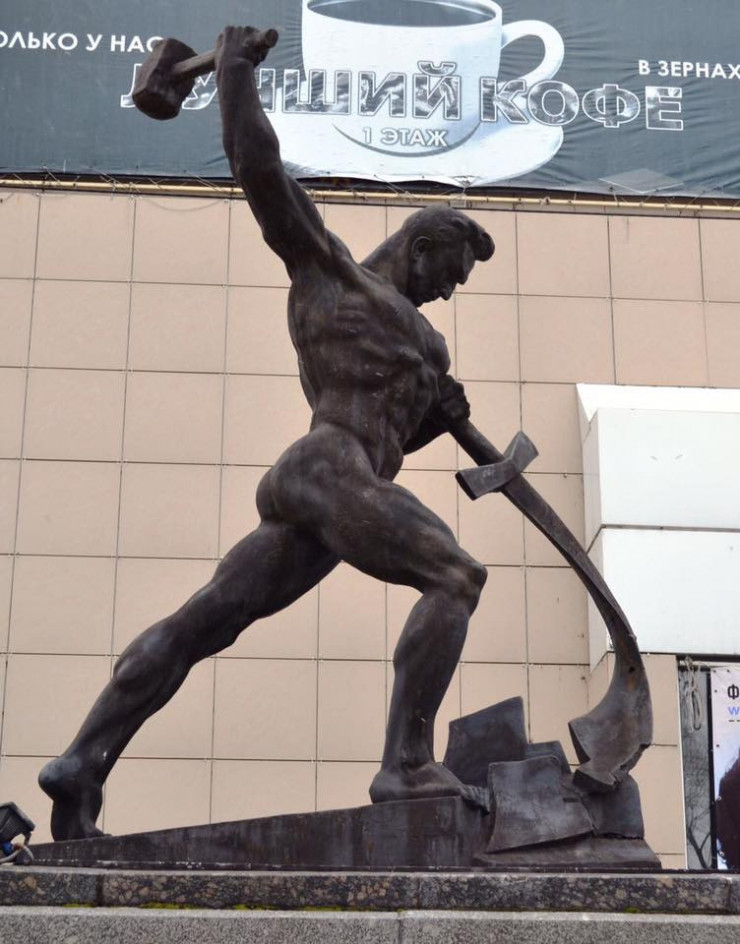 В Усть-Каменогорске стоит копия скульптуры известного советского монументалиста Евгения Вучетича "Перекуем мечи на орала".