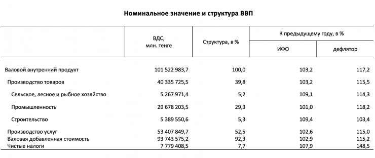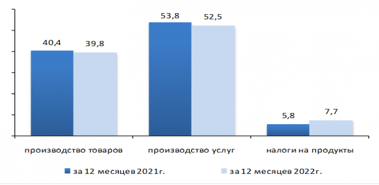Доли производства товаров и производства услуг в ВВП за январь-декабрь 2022 года составили 39,8 процента. Основную долю в производстве ВВП составляет промышленность – 29,3 процента.