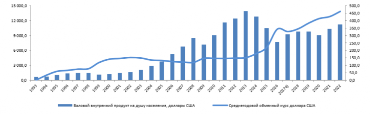 Замедление роста в номинальном выражении ВВП на душу населения в долларах США обусловлено ослаблением обменного курса тенге с 326 тенге за доллар США в 2017 году до 460,48 тенге в 2022 году.