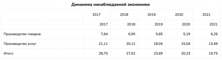 Уровень ненаблюдаемой экономики в ВВП 2021 года сократился на 0,48 процента и составил 19,75 процента от ВВП, из них доля незаконной деятельности - 1,35 процента от ВВП.