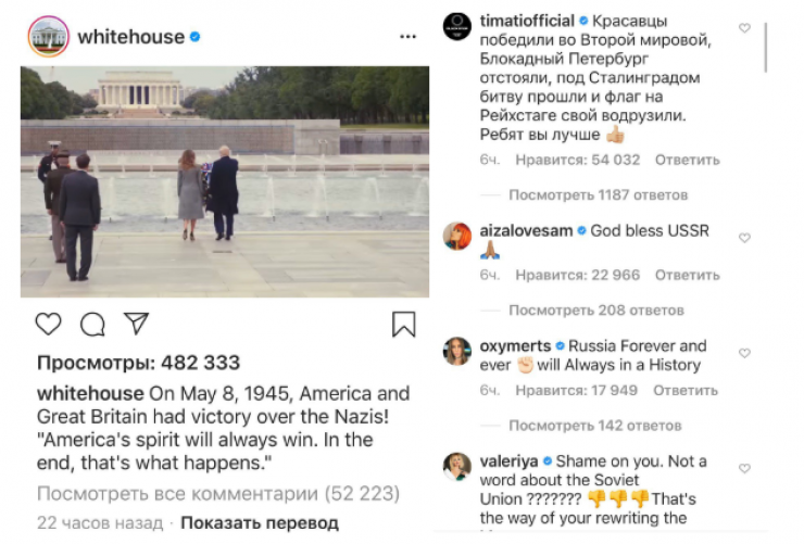 Российские артисты возмутились данным фактом, в частности, что Белый дом никак не упомянул роль Советского Союза во Второй мировой войне. Пользователи начали высказывать свое мнение под постом либо жаловаться на спам.