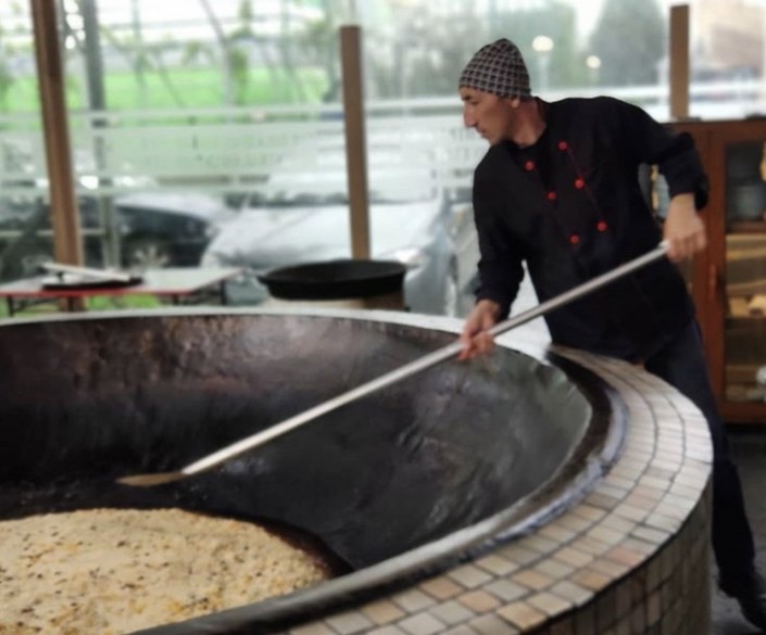 Его начинают готовить с утра во дворе, на дровах и сразу в нескольких огромных чугунных казанах. К 11 часам блюдо готово. Захотите его отведать - приходите до четырех часов, в противном случае к пяти часам застанете только пустые котлы. Также тут подают чай, лимонады и несколько салатов. Алкоголя нет.