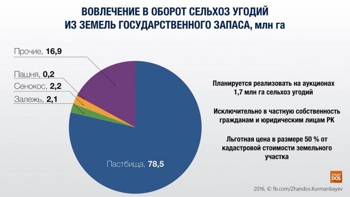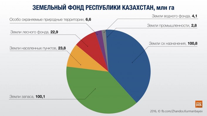 По данным Министерства национальной экономики, общая площадь земель, предоставленная для ведения сельского хозяйства (не вся земля Казахстана, а только предназначенная для сельского хозяйства), составляет 100,8 миллиона гектаров. При этом, лишь 1,3 процента (1,3 миллиона гектаров) находятся в частной собственности. К 1 июля 2016 года в министерстве готовы выставить на аукцион 1,7 миллиона гектаров земли.