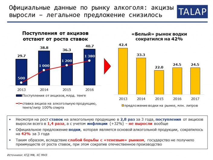 При анализе Налогового кодекса мы обнаружили, что ставки акцизов на алкогольную продукцию за три года выросли в 2,8 раза, а на пиво - в 1,5 раза. В 2013 году акцизы на алкоголь обеспечивали бюджет на 30 миллиардов тенге налогов, поэтому мы ожидали увидеть почти 100 миллиардов тенге в 2016 году.
