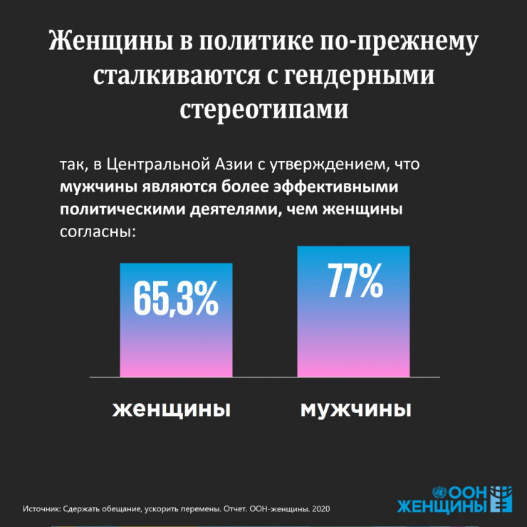 На формирование такого отношения влияют гендерные роли и стереотипы, существующие во многих обществах, в том числе в нашем. С детства девочкам внушают, что их миссия в жизни ограничена только материнством и замужеством. Состоятельность женщины определяют браком (и желательно в ранней молодости), наличием семьи, детей. В таких обществах сильно недооцениваются их потенциал и возможности, и из-за этого женщины, выбирающие политическую карьеру, постоянно сталкиваются с дискриминацией по половому признаку. При этом давно доказано, что активная позиция и участие женщин в процессах принятия решений страны способствуют развитию и процветанию общества.