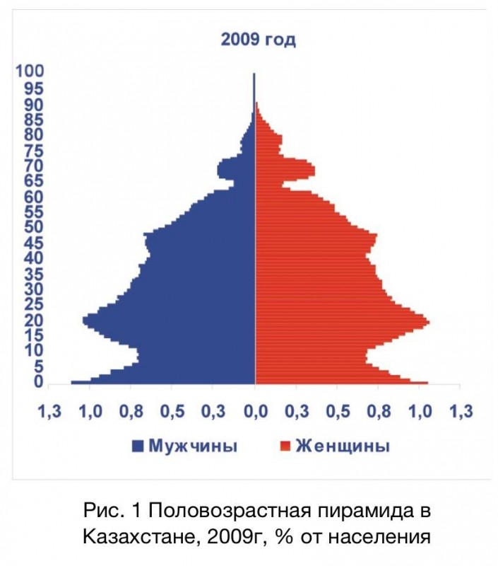 Действительно, графическая репрезентация (Рис. 1) поло-возрастного соотношения в Казахстане подтверждает данную гипотезу, и более того, взгляните на секцию 20-летнего возраста: мужчин и женщин одинаковое количество! То есть в бракосозидательном возрасте в Казахстане ровно столько же мужчин, сколько и женщин. Миф разрушен!
