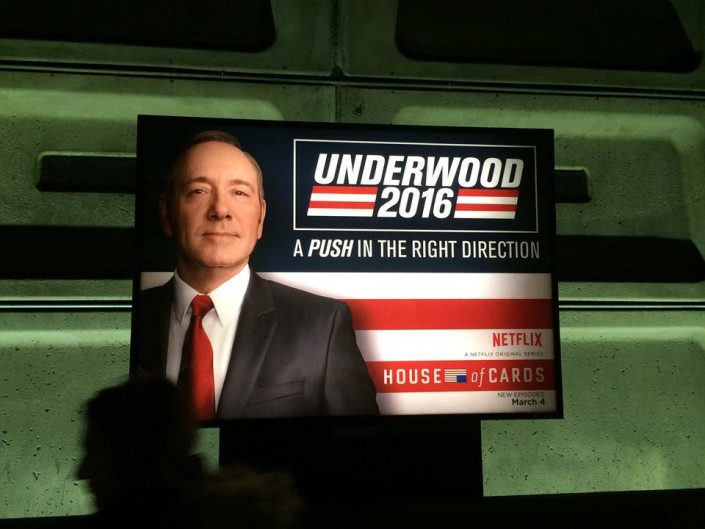 Но во всей текущей электоральной гонке я просто восхищен одной медийной стратегией. Этот кейс по продвижению телевизионного продукта нужно включить в соответствующие университетские программы и учебники. Я говорю о стартовавшем сегодня четвертом сезоне сериала "Карточный домик", в котором главный герой тоже участвует в президентской гонке. Его "предвыборная агитация" захлестнула Вашингтон. Эту фотографию я сделал на станции метро. Если сравнивать с Трампом, думаю, Андервуд - более достойный кандидат.