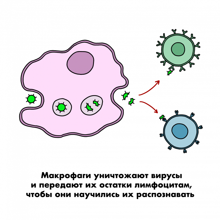 Макрофаги дают сигналы остальным подразделениям иммунной системы, чтобы они тщательно подготовились к борьбе с коронавирусом. Делают они это, как бы выплевывая остатки уничтоженных вирусов, с тем чтобы Т- и В-лимфоциты научились их распознавать и быстро реагировать при повторном вторжении врага в организм.