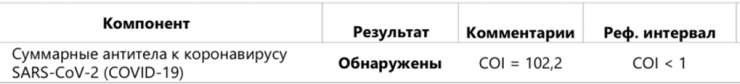 Некоторые лаборатории анализируют суммарные антитела, не разделяя их на классы M и G. Они могут использовать другие референсные значения, например менее 1 единицы, как это представлено в данной таблице. Уровень суммарных антител в 102,2 единицы свидетельствует об их наличии в крови. Если их уровень был бы менее 1 единицы, то это говорило бы об их отсутствии.