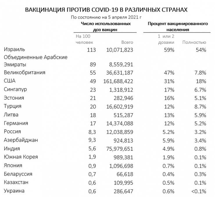 Уже треть населения Соединенных Штатов, а также более 50 процентов взрослых израильтян и британцев получили по меньшей мере по одной дозе вакцины против коронавируса. Это стало возможным благодаря партнерским взаимоотношениям руководителей этих стран с производителями вакцин, эффективной логистике и четкой организации массовой вакцинации.