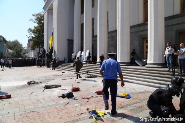 По словам очевидцев, во время очередной волны столкновений митингующих против изменений Конституции Украины с бойцами Нацгвардии, МВД и службой охраны парламента неизвестный бросил в толпу боевую гранату, которая взорвалась.