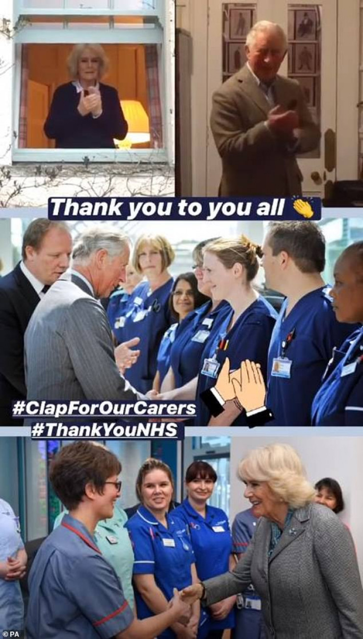 Тем временем принц Чарльз и его супруга Камилла также поделились коллажем из фотографий, на которой принц его жена стоя аплодируют.