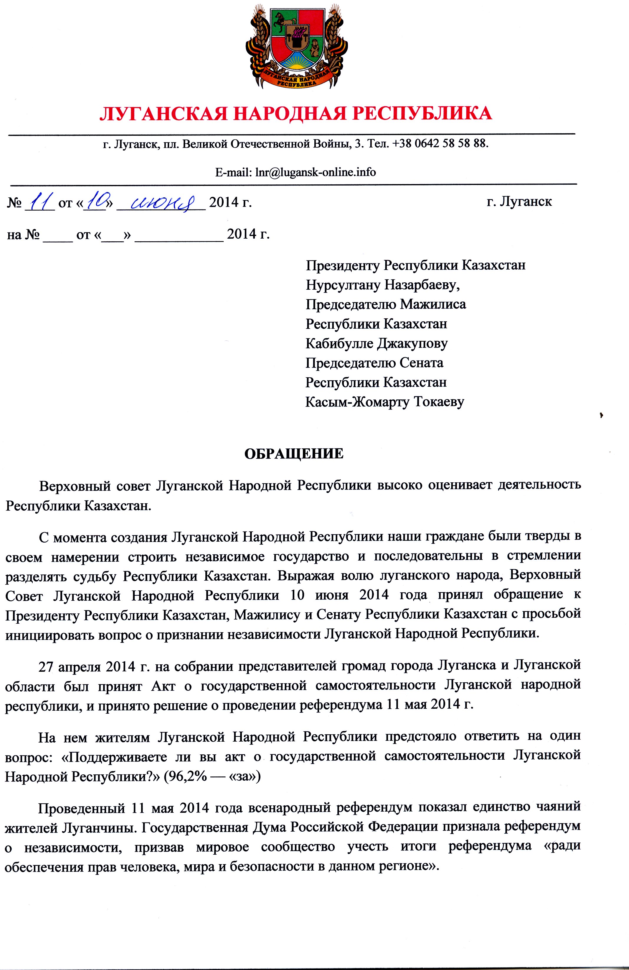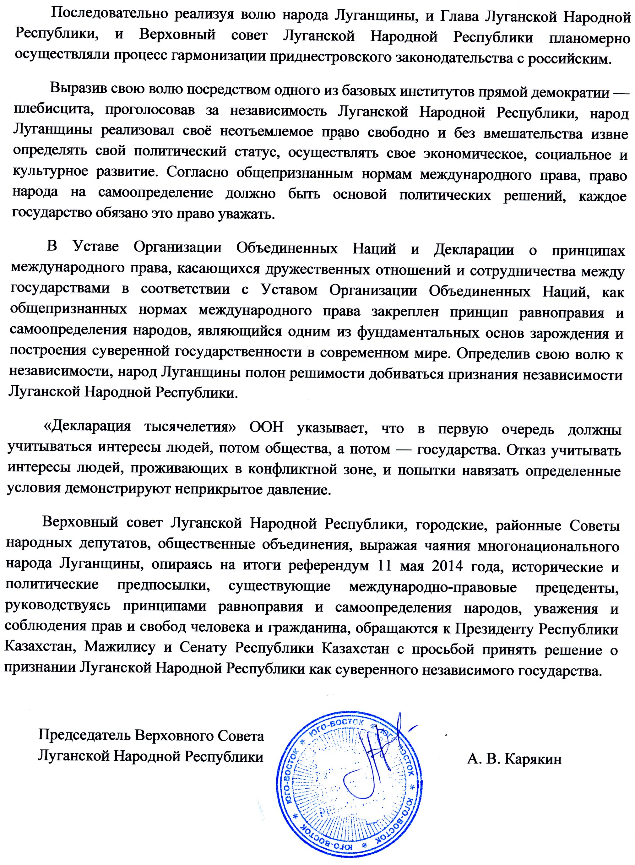 Самопровозглашенная "Луганская народная республика" официально обратилась к Казахстану и другим государствам с просьбой о признании ее независимости. Текст обращений, подписанный "главой Верховного совета ЛНР" Алексеем Карякиным, опубликован 11 июня на официальном сайте "Луганской народной республики", сообщает Tengrinews.kz.