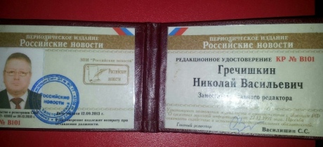Служба безопасности Украины (СБУ) на своем сайте сообщила о задержании 23 октября под Киевом российского гражданина, у которого во время обыска было найдено удостоверение помощника депутата Госдумы и заместителя главного редактора издания "Российские новости" на имя Николая Гречишкина.