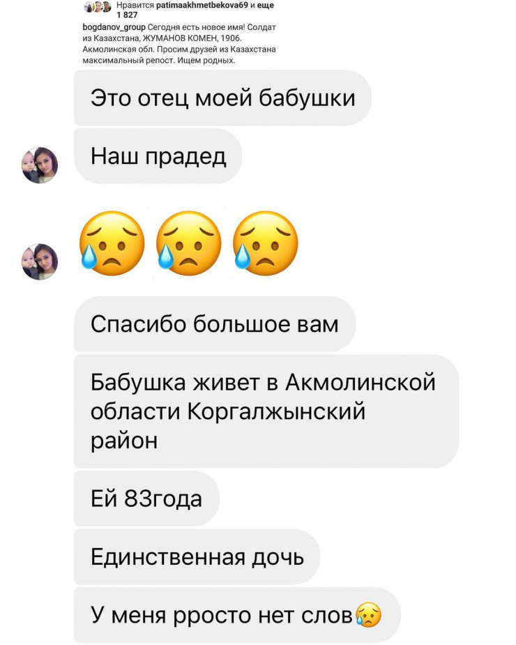 На публикацию откликнулись правнуки солдата, сообщив, что у него есть единственная дочь Мадениет Жуманова, которая живет в Коргалжынском районе Акмолинской области.