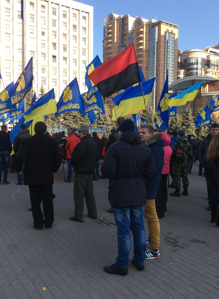 Митинг уже собрал порядка 400-500 человек, основу которых составляют люди с флагами "Свободы" и украинской символикой. Собравшиеся выкрикивают "Без свободы - нет парламента", "Сливают Свободу, сливают Украину", а также традиционные патриотические "кричалки".