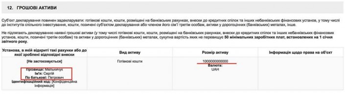 В разделе денежных активов Мельничук написал, что наличными у него есть триллион гривен. Денег на банковских счетах нет.