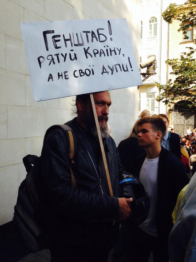 С сооруженной трибуны слышно недовольство митингующих рукопожатием Порошенко с Путиным в Минске. Собравшиеся призывают весь мир признать Россию агрессором. Среди не политических лозунгов - в штаб АТО должны войти те, кто принимал участие в военных действиях. В частности, люди в камуфляже недовольны действиями министра обороны Украины - Валерия Гелетея, который в прошлом не был военным, а работал милиционером.