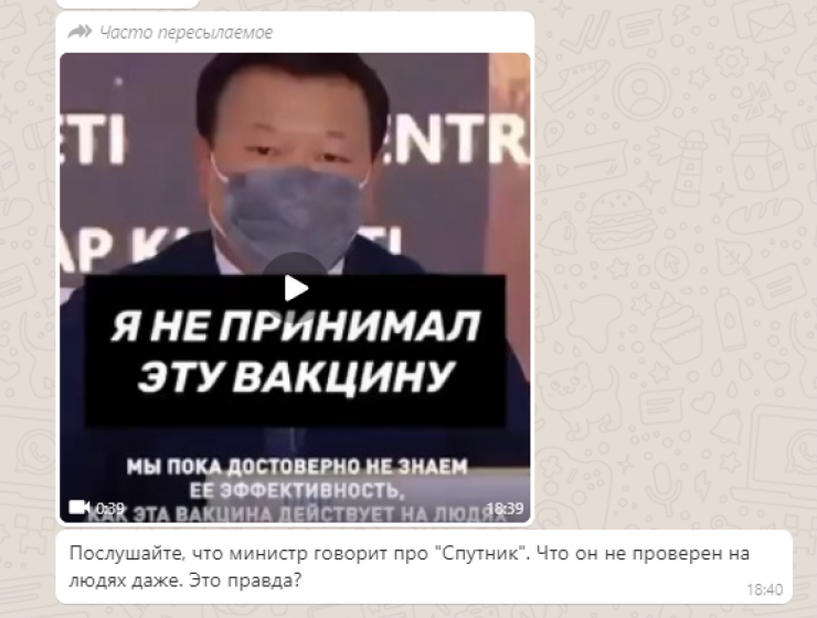 В социальной сети TikTok распространяется видео с отрывками из брифинга СЦК, на котором выступал министр здравоохранения Алексей Цой. В кадре он говорит, что вакцина против COVID-19 не изучена и ее влияние на людей неизвестно. Авторы ролика утверждают, что речь идет о вакцине "Спутник V". Портал Stop Fake назвал видео манипуляцией, а слова министра "вырванными из контекста", передает Tengrinews.kz.