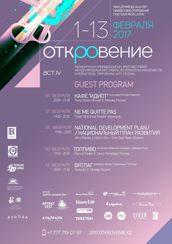 В гостевую программу 2017 года приглашены театры из Москвы, Армении, Санкт-Петербурга и Латвии. Все они впервые приедут в Казахстан. "В 2017 году мы снова не получили поддержку государства. Но нас по-прежнему поддерживают партнеры. Благодаря их поддержке, получилась большая образовательная программа: это лаборатория социального и инклюзивного театра, лаборатория финской современной драматургии и лаборатория театра участия, которая пройдет совместно с молодыми казахстанскими художниками. Вообще, на фестивале каждый год, практически ко всем блокам, можно применить слово "впервые". Значит, есть куда стремиться, расти и радовать наших зрителей таким разным и удивительным современным театром. Я по-прежнему желаю каждому зрителю фестиваля найти свое откровение и поделиться им с окружающими", - сказала продюсер и директор фестиваля Ольга Султанова.