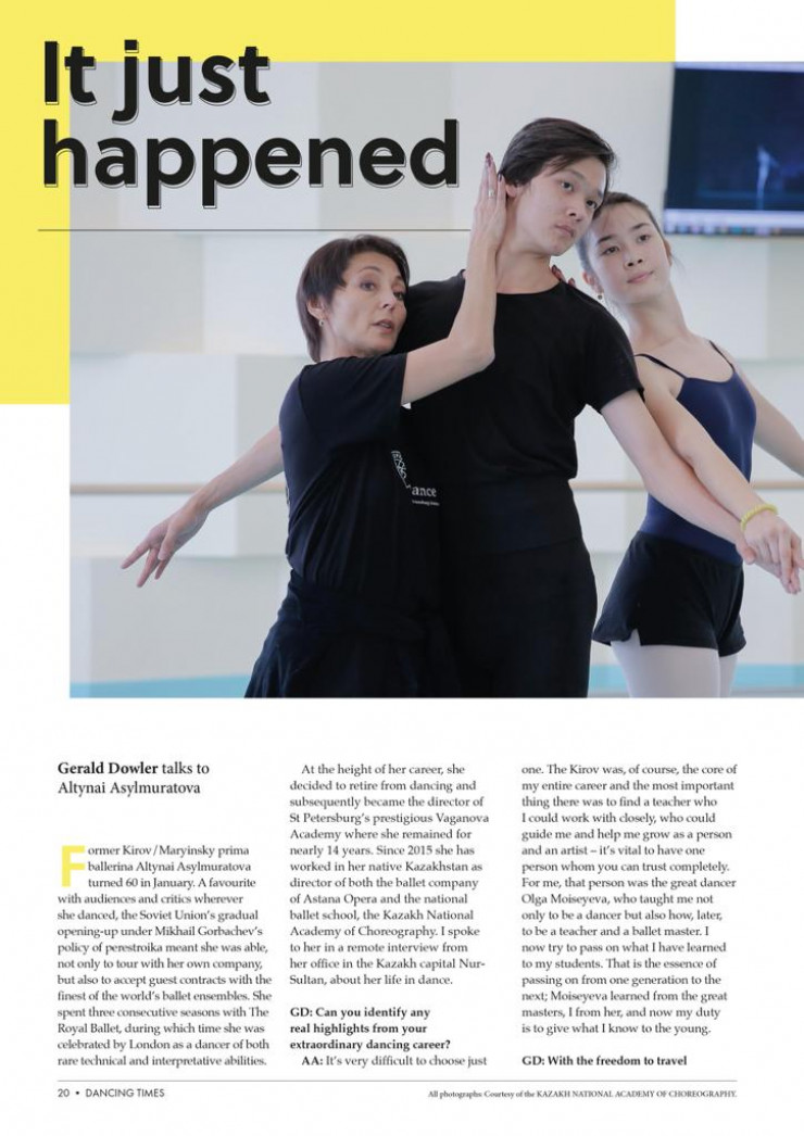 Ректор Казахской национальной академии хореографии, художественный руководитель балетной труппы театра "Астана Опера" Алтынай Асылмуратова дала интервью старейшему в мире изданию о танце - английскому журналу Dancing Times, передает корреспондент Tengrinews.kz.